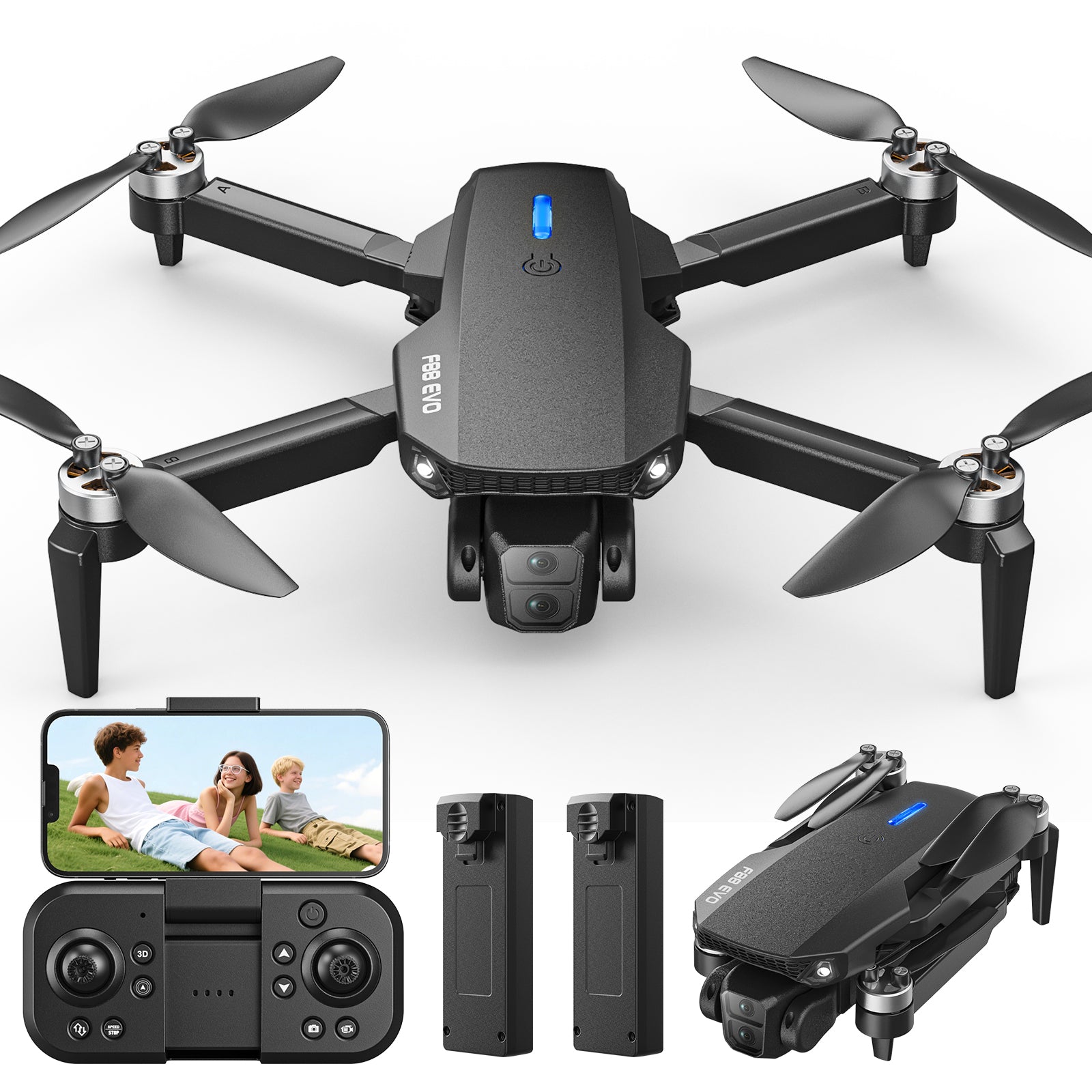 Wefone F88 Drone with 720P Camera for Kids and Adults, Gesture Control, 2 Batteries, Black